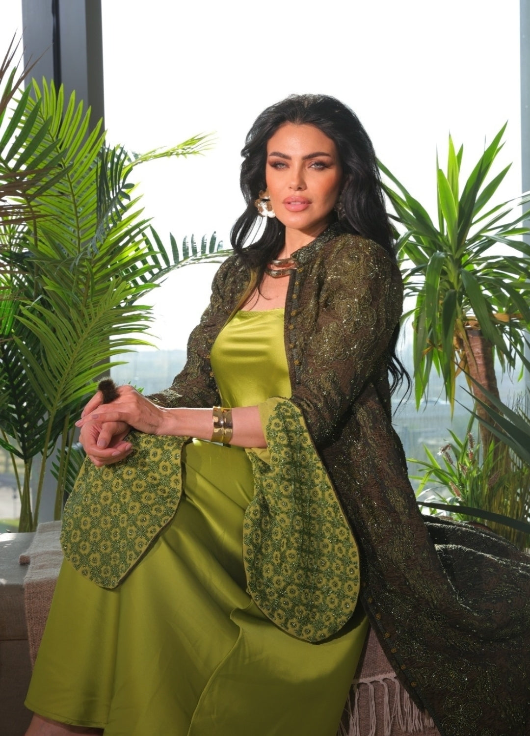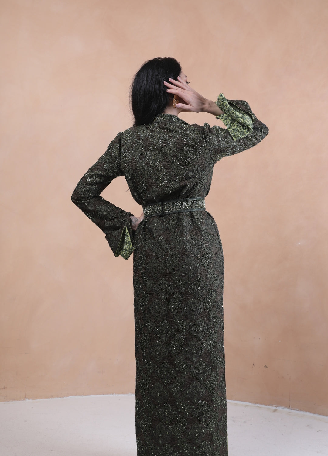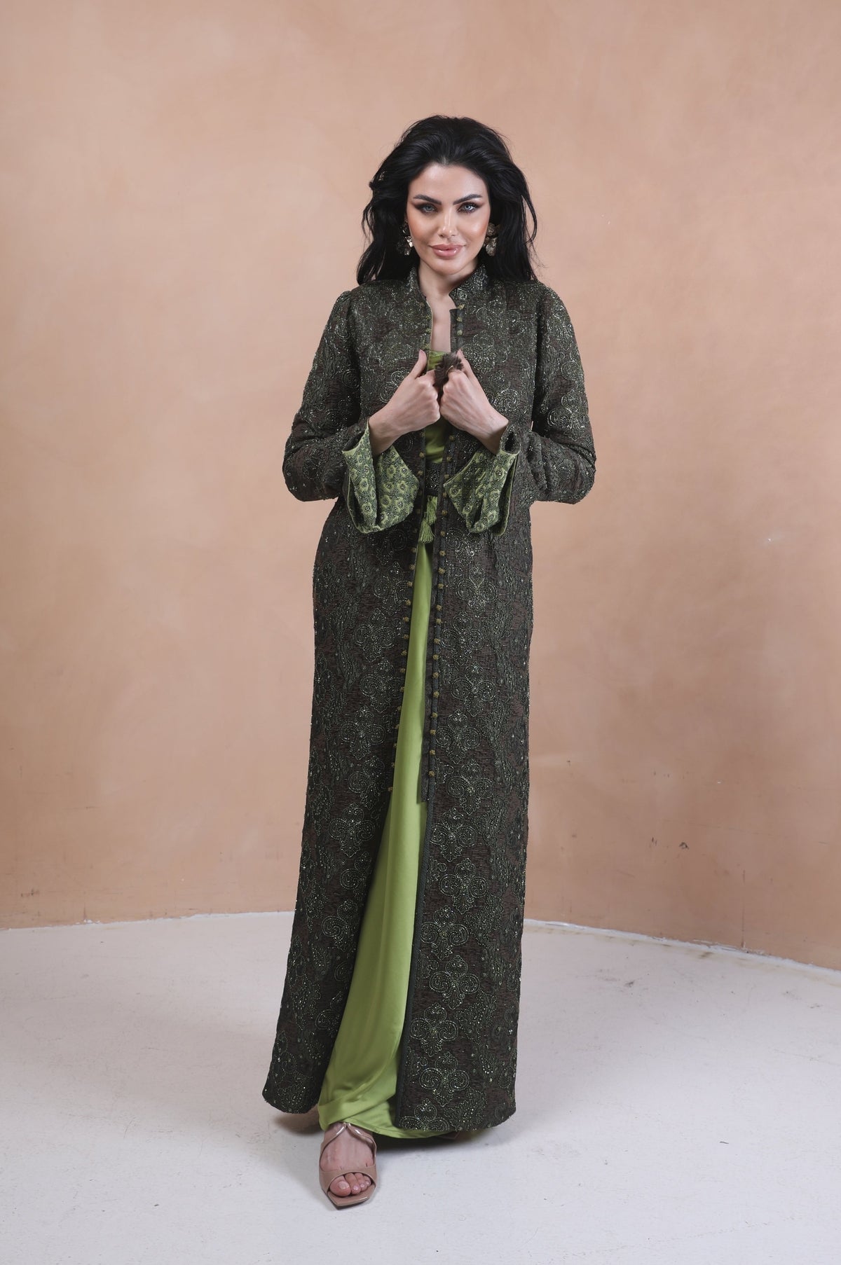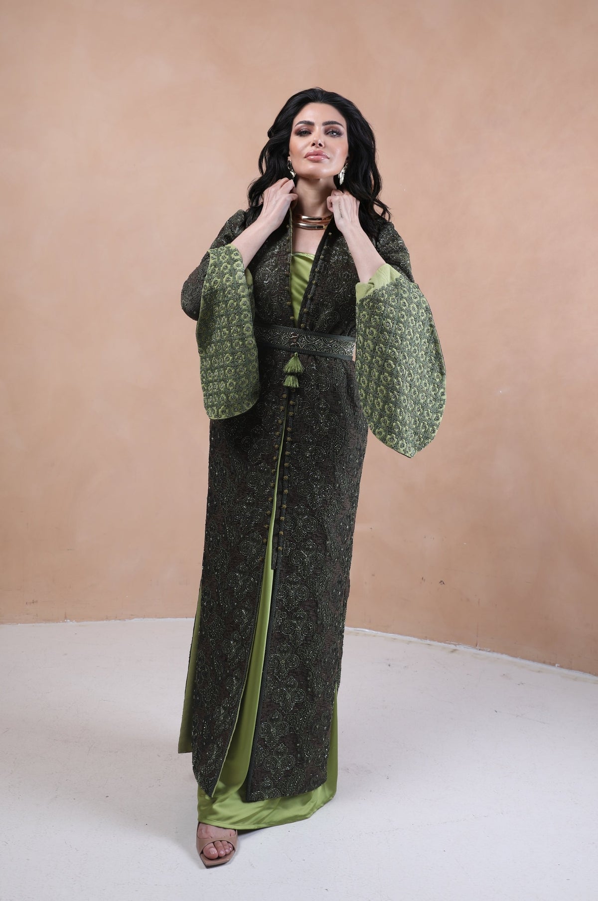 Experience refined elegance with this exquisitely hand-embroidered abaya, a true masterpiece of craftsmanship. This stunning garment features intricate full-hand embroidery on a dark, luxurious fabric, showcasing exceptional detail and artistry.The design is enhanced by a sophisticated high collar and graceful bell sleeves that open to reveal a vibrant lime-green inner lining, creating a beautiful and striking contrast. A matching embroidered belt cinches the waist, completing the look with a flattering and elegant silhouette. This abaya is the perfect statement piece for special occasions, blending traditional artistry with modern style.