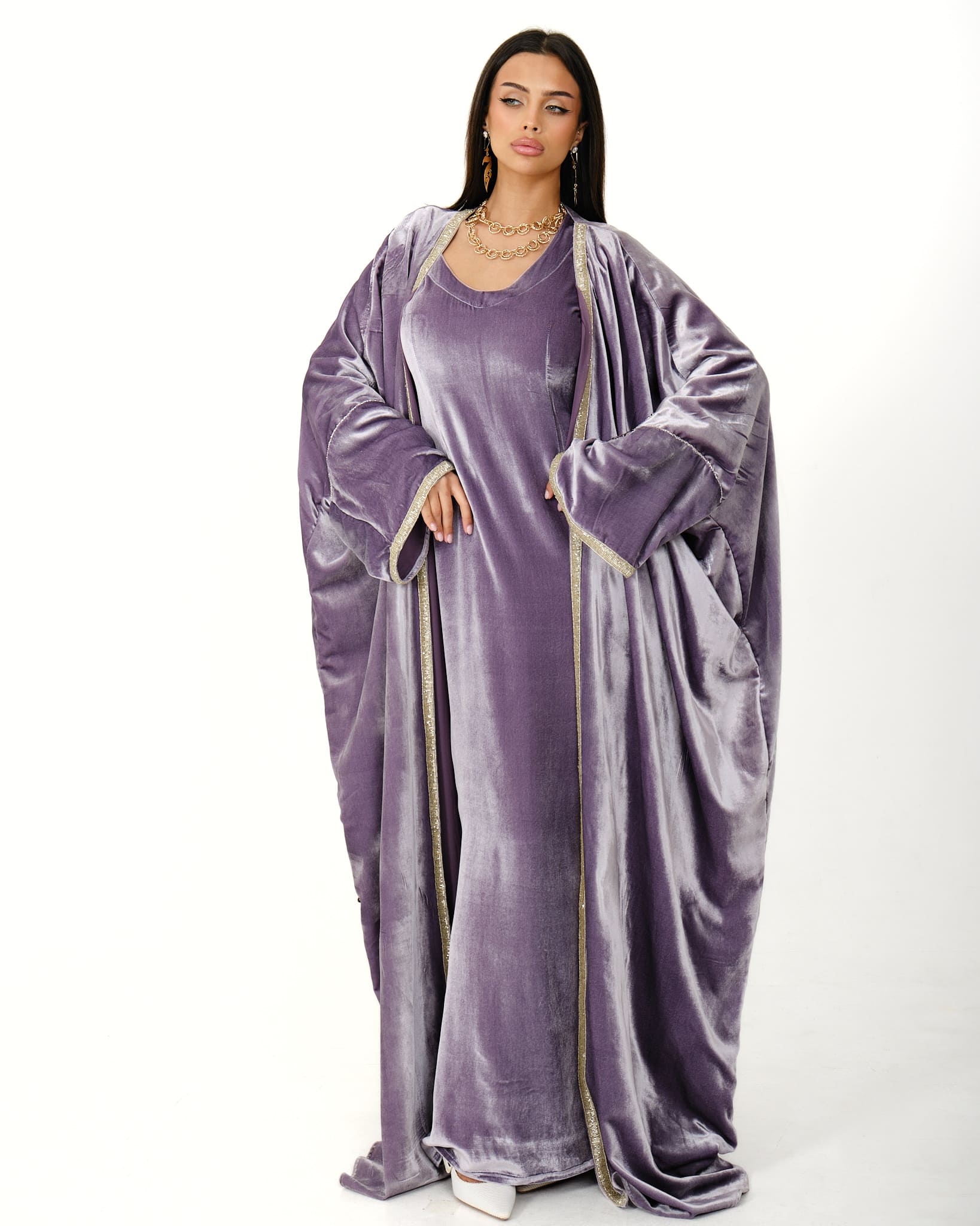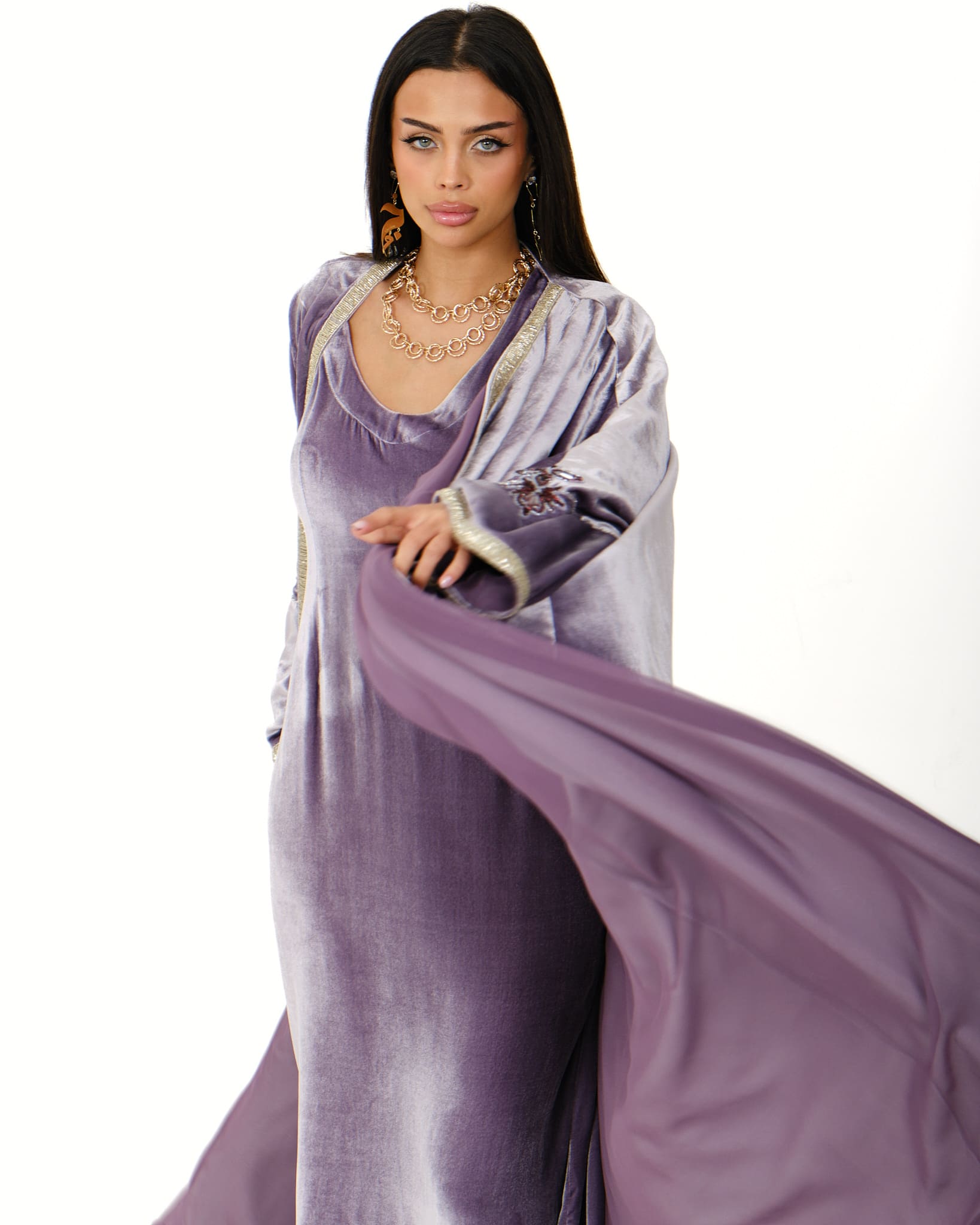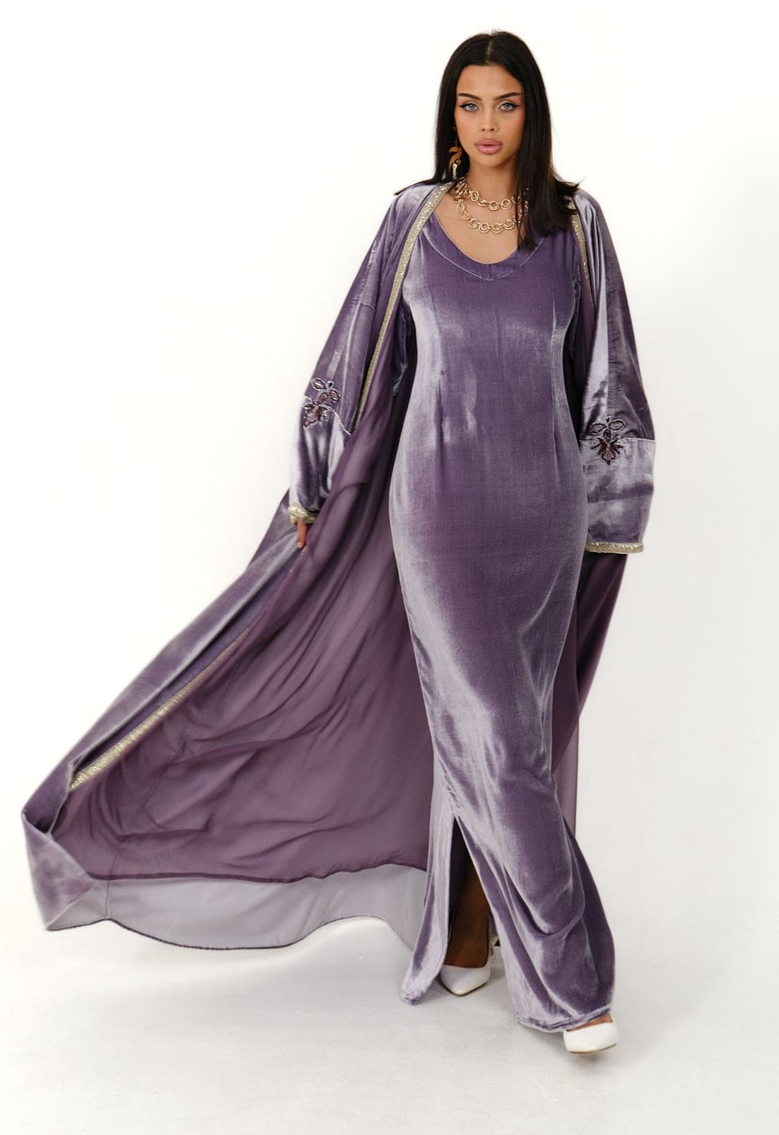 Elevate your elegance with this silk velvet abaya set, a perfect blend of luxury and sophistication. Crafted from premium silk velvet, the abaya drapes beautifully, featuring intricate embroidery on the sleeves and delicate embellishments for a subtle shimmer. Paired with a back-adjustable dress, this set offers both comfort and versatility, making it an ideal choice for special occasions. Effortlessly chic and timeless, it’s a must-have addition to your wardrobe. (Abaya One size - Total length 160cm, Sleeve length from centre back 82cm, Back 124cm, Dress - (Length of dress 152cm ,Sleeve length 56cm, Back 40cm, Waist round maximum width 105cm, Waist round minimum width 72cm, Hip round 120cm). Size model wearing is S/M.
