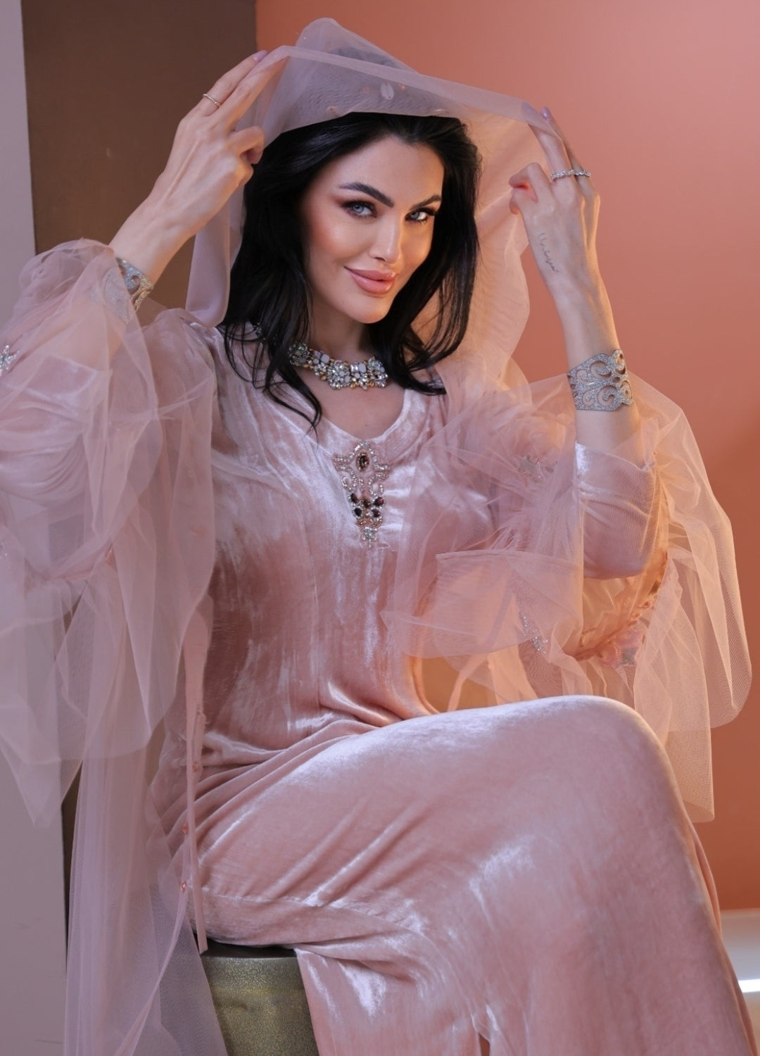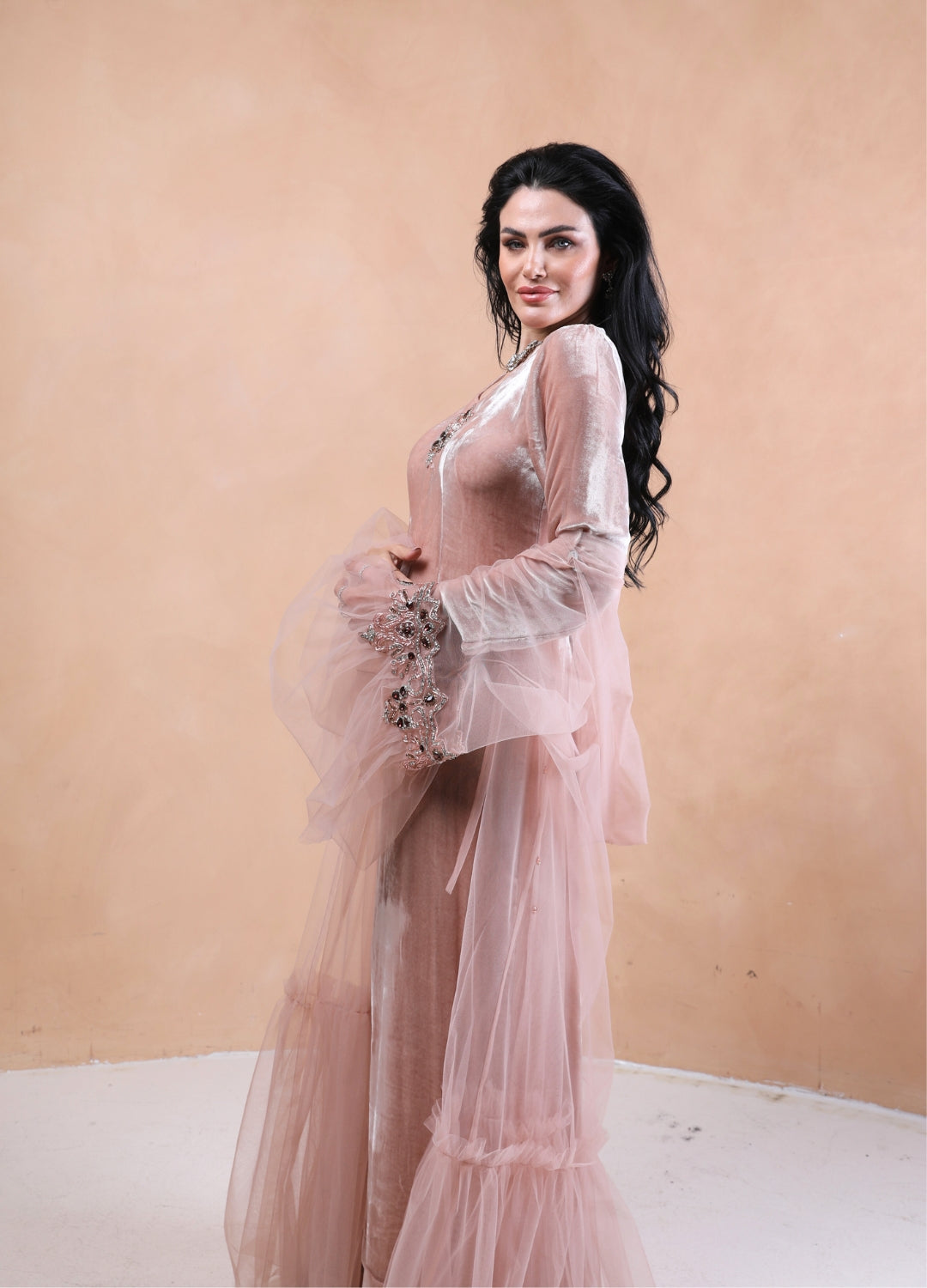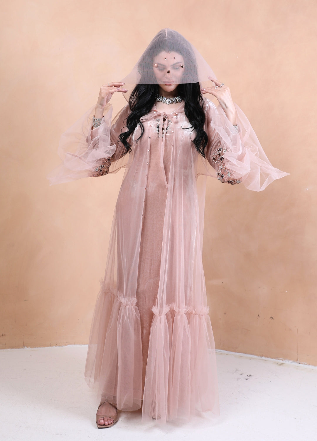 Step into ethereal elegance with our Sugar Icing Hooded Kaftan set, a mesmerizing fusion of sheer luxury and regal charm. Crafted from delicate, airy tulle, the kaftan drapes effortlessly, creating a weightless, dreamlike silhouette. The addition of a gracefully flowing hood adds an enchanting touch, making it perfect for both contemporary and vintage-inspired styling. Paired with a luxe silk velvet dress, this set exudes sophistication and opulence. The rich texture of velvet beautifully contrasts with the gossamer-like tulle, offering a refined yet bold statement. Whether you're attending a soirée, an intimate evening event, or a modern bridal celebration, this ensemble is designed to make you feel effortlessly divine.