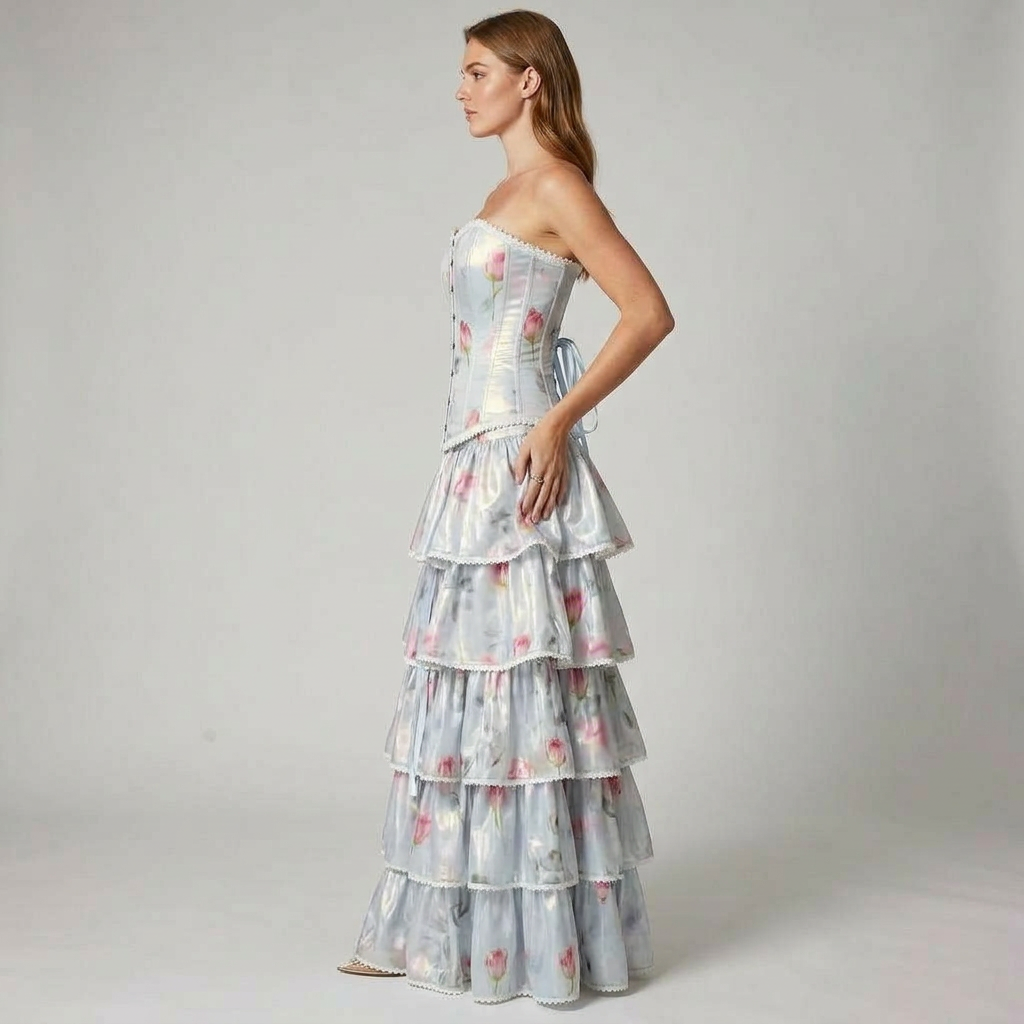 The Cinderella Set is a two-piece ensemble blooming with floral charm in 100% cotton. Made with delicate lace trim and a front tie. The show stopping high-waisted skirt cascades in playful tiers of the same floral fabric, each edged with delicate lace for texture and movement, creating a dramatic, flowing silhouette perfect for stylish statements at warm-weather events.