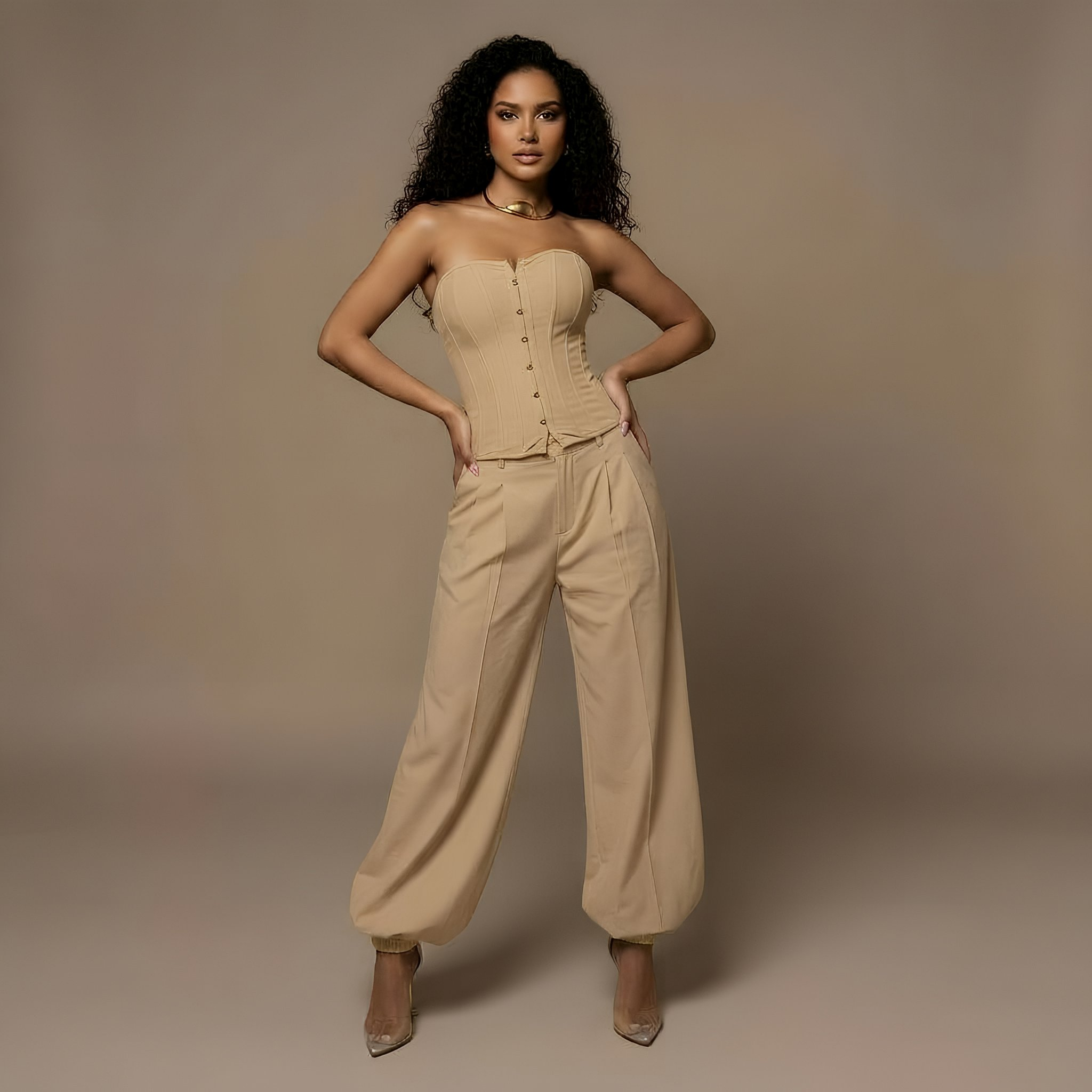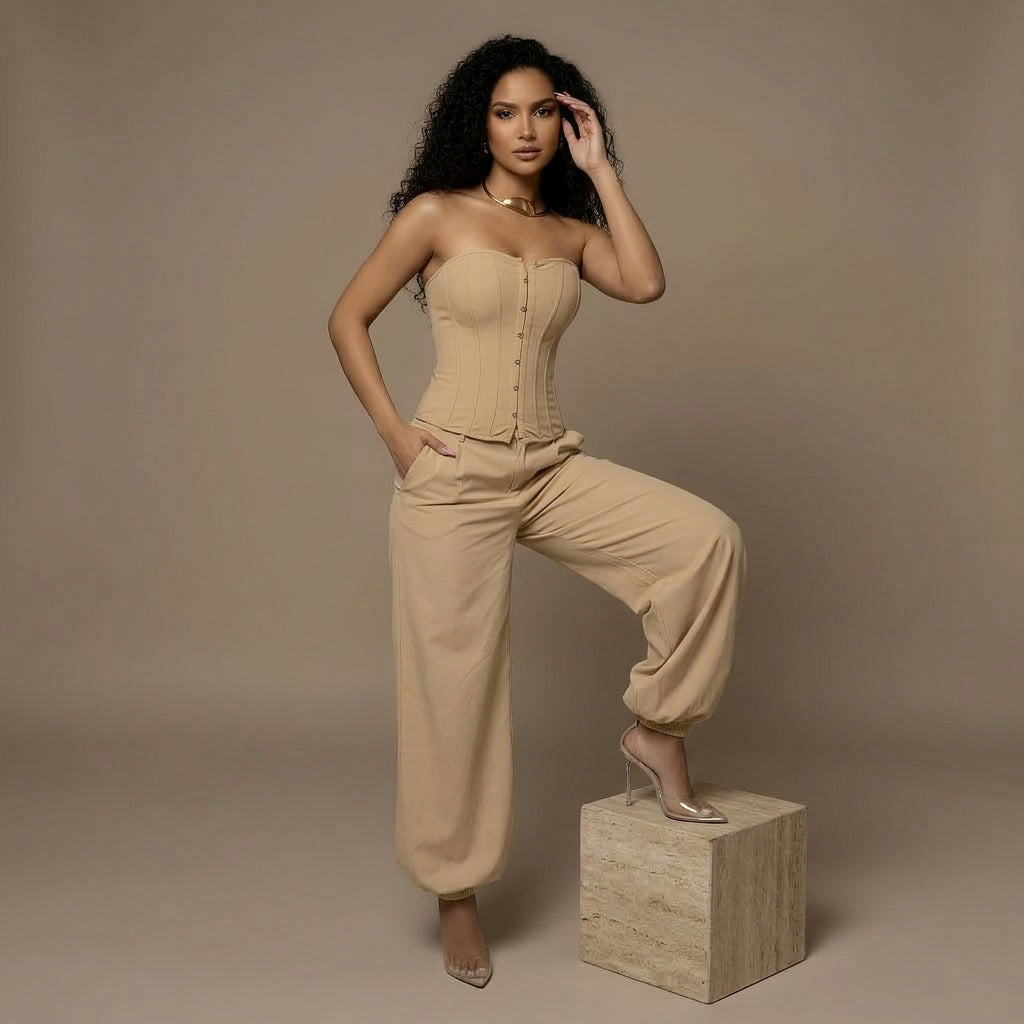 Pant: Vertical paneling and a curved bottom hem ensure the corset sits perfectly over the trousers for a seamless look.