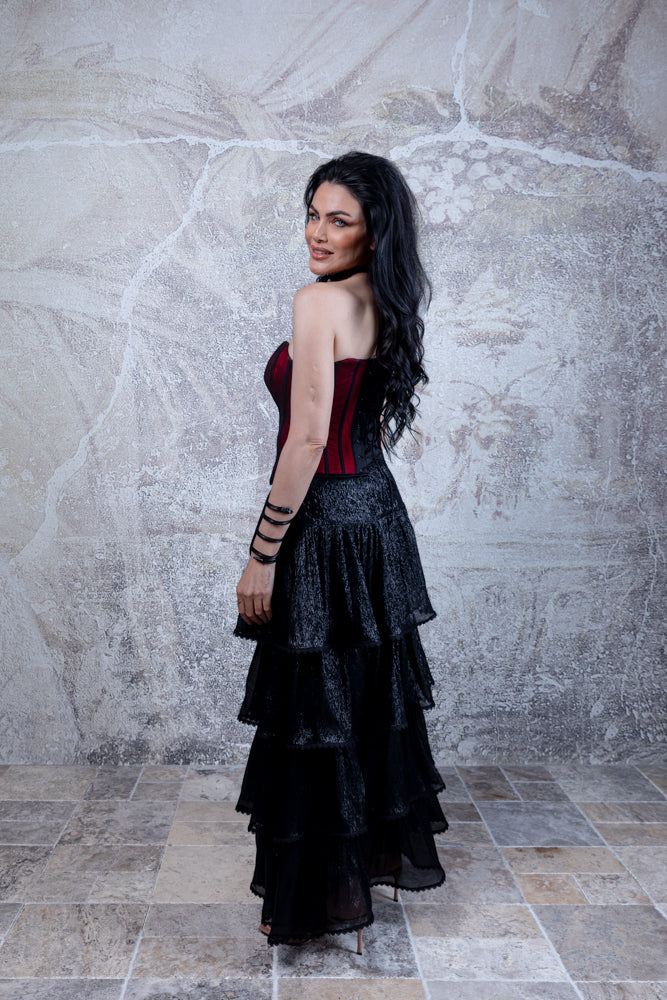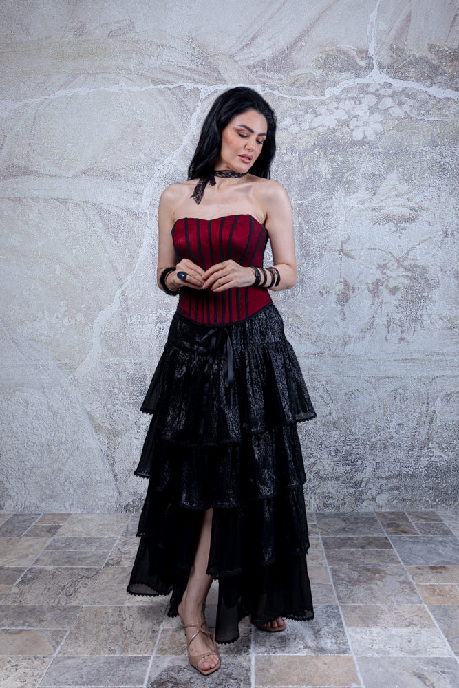 Scarlet Set, a powerful two-piece designed for ultimate glamour. The top is a figure-sculpting corset, featuring striking scarlet red and black vertical stripes over supportive boning to instantly cinch your waist and create a perfect hourglass silhouette. This bold structure is dramatically balanced by the flowing, multi-tiered maxi skirt in deep black. The skirt's voluminous layers have a subtle metallic sheen, adding shimmering movement and romantic texture that perfectly completes this high-impact, statement-making ensemble.