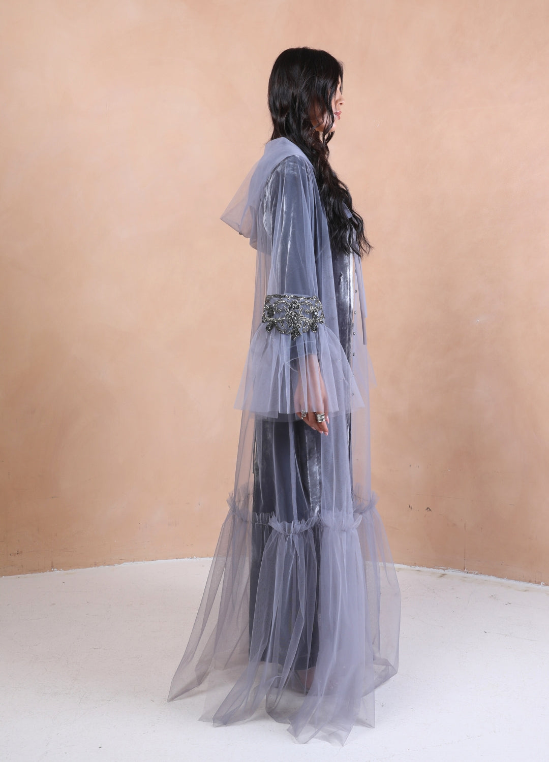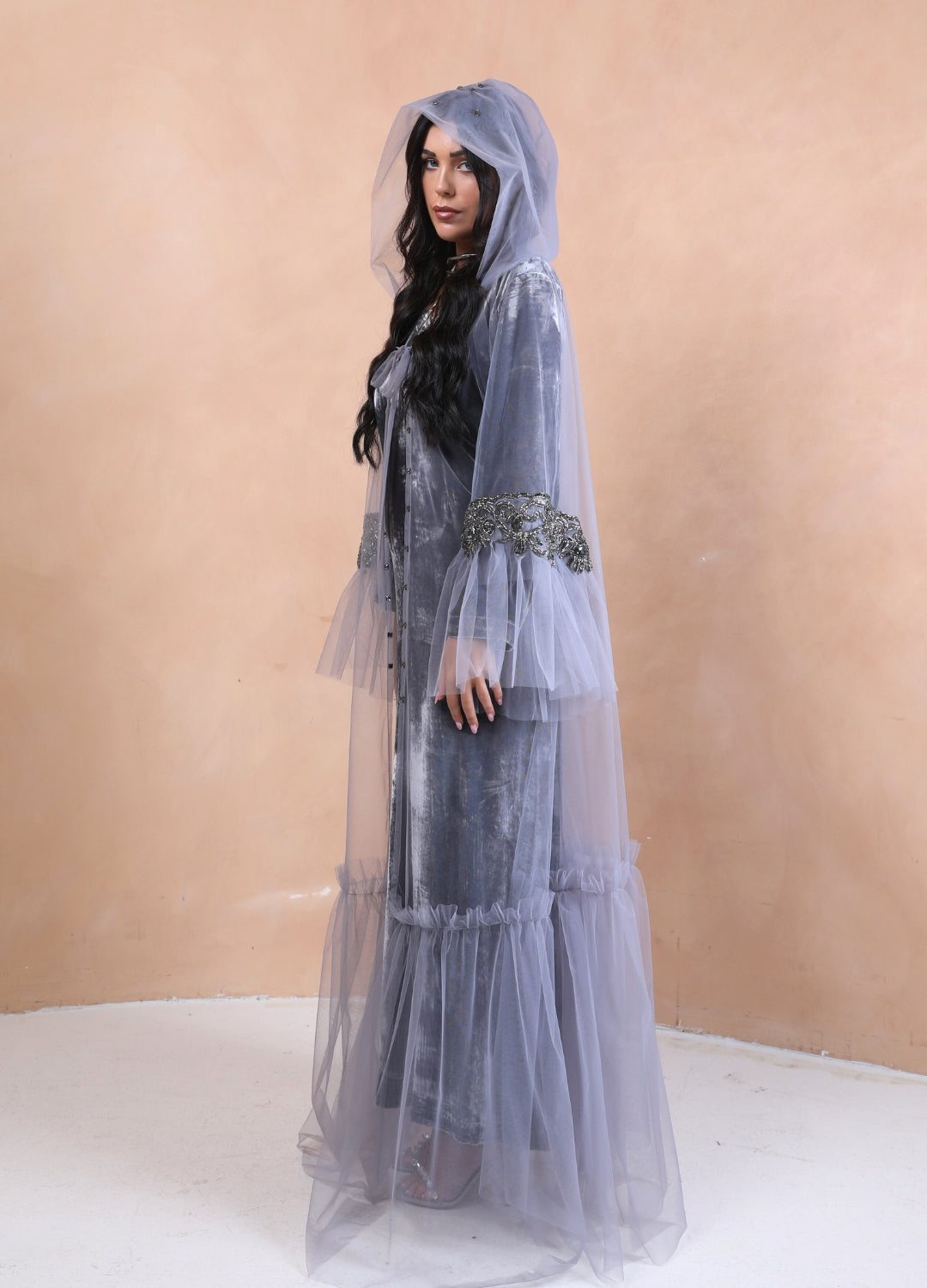 Step into ethereal elegance with our Sugar Icing Hooded Kaftan set, a mesmerizing fusion of sheer luxury and regal charm. Crafted from delicate, airy tulle, the kaftan drapes effortlessly, creating a weightless, dreamlike silhouette. The addition of a gracefully flowing hood adds an enchanting touch, making it perfect for both contemporary and vintage-inspired styling. Paired with a luxe silk velvet dress, this set exudes sophistication and opulence. The rich texture of velvet beautifully contrasts with the gossamer-like tulle, offering a refined yet bold statement. Whether you're attending a soirée, an intimate evening event, or a modern bridal celebration, this ensemble is designed to make you feel effortlessly divine.